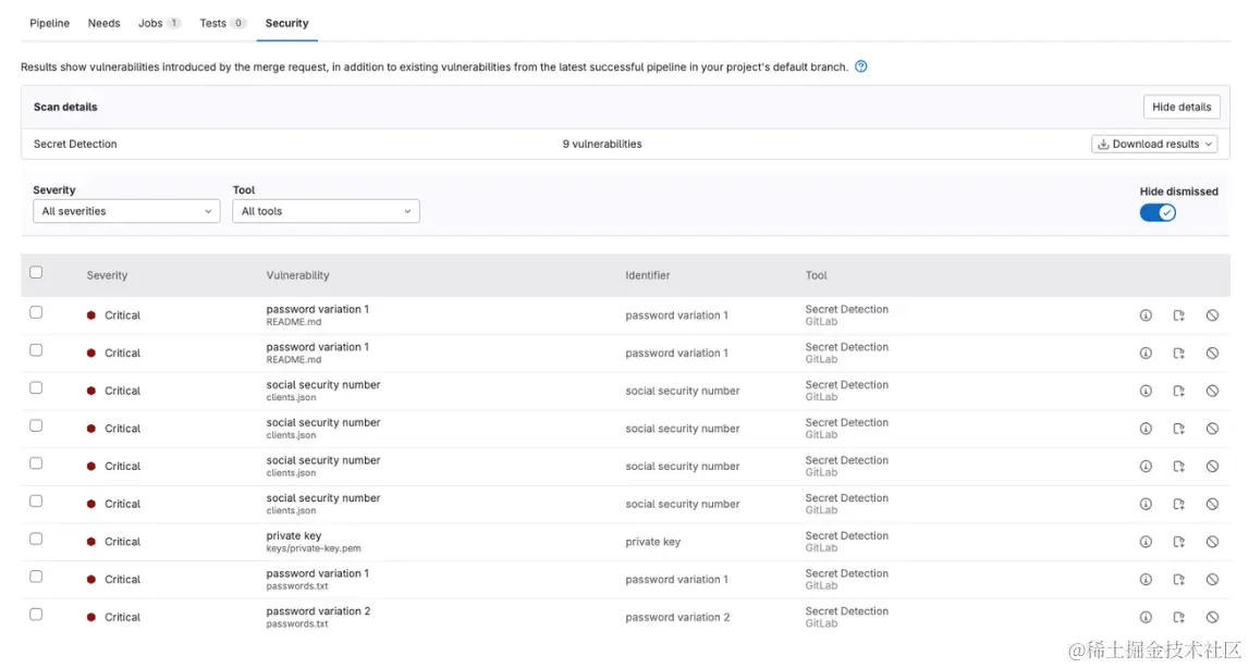 所有启用的安全分析器都在流水线中运行,并将其结果作为制品输出。这些制品将被处理,包括重复数据删除,结果会列在“流线型安全性”选项卡上。您还可以从此处下载生成的 JSON 文件。