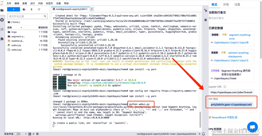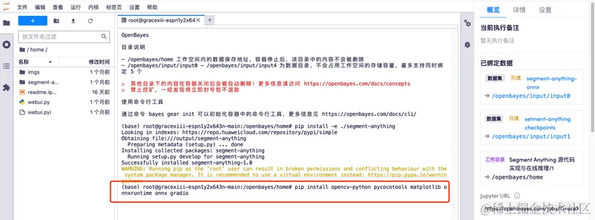 然后运行 pip install opencv-python pycocotools matplotlib onnxruntime onnx gradio 命令安装所需依赖。