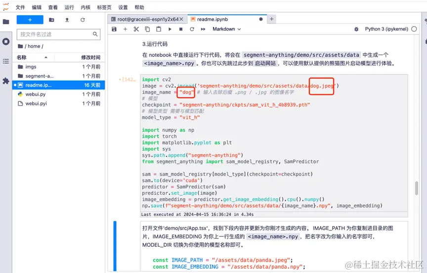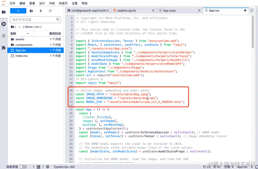 然后我们返回到 segment-anything/demo/src 目录,找到 App.tsx, IMAGE_PATH 为复制进目录的图片,IMAGE_EMBEDDING 为上一行生成的 <image_name>.npy,把名字改为输入的名字即可,MODEL_DIR 切换为使用的模型名称即可。