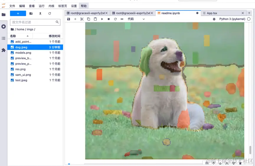 如已经使用在线推理网站,需要在已运行的终端输入 ctrl + c 终止当前网站的运行。首先要对需要分割的图片进行预处理,在左侧文件管理器中打开 segment-anything/demo/src/assets/data 目录,将想要处理的图片命名好并添加进去,这里用小狗的图片举例。