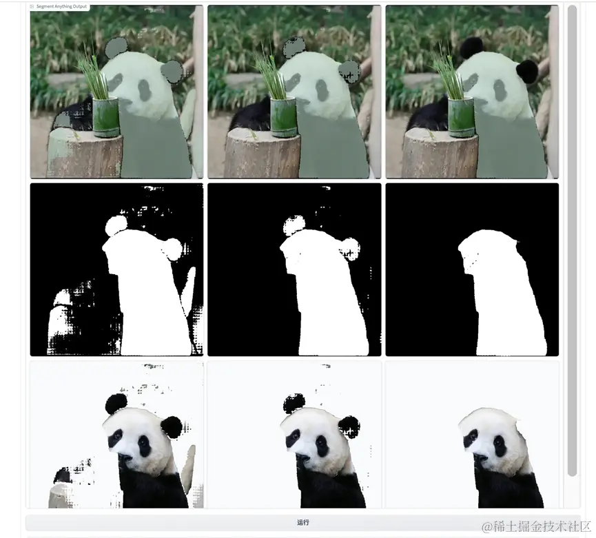 如果我们想要把熊猫给分割出来,可以在下图位置输入点坐标,比如(400,550),(400,250)这两个点分别选中了熊猫的头和身体,我们用这两个点去分割图像,点击「运行」即可。