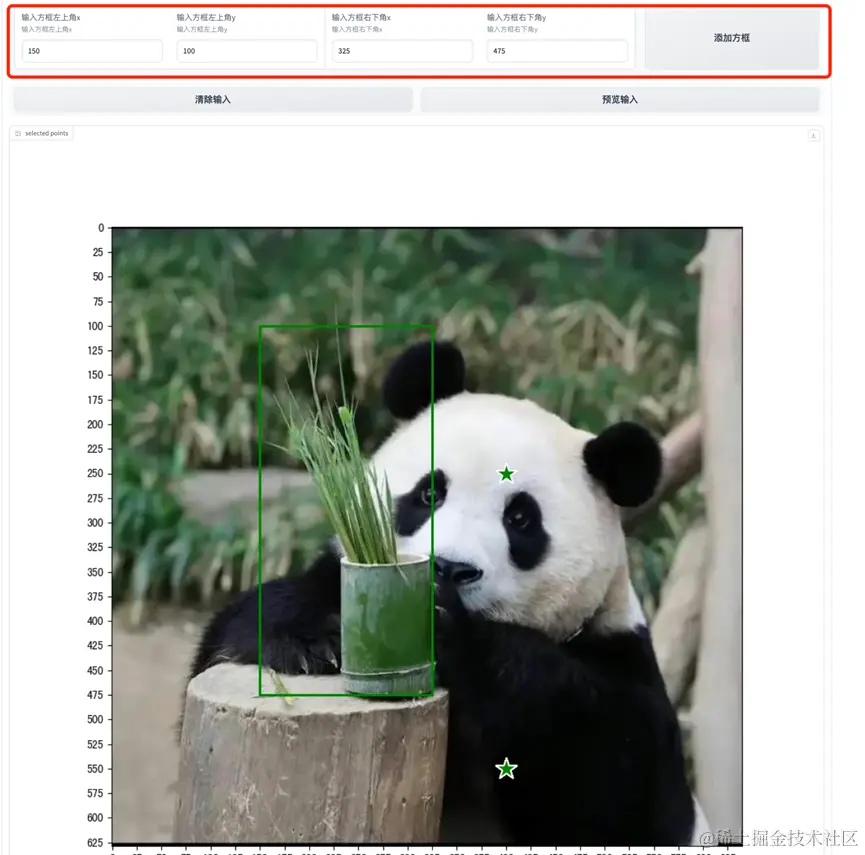 我们还可以使用方框来将竹子分割出来。使用过方框输入需要方框左上角和右下角的点,这个竹子所在方框左上角的点位于(150,100),右下角的点位于(325,475),输入好之后我们点击「添加方框」,再点击预览输入,即可看见有一颗方框框住了这个柱子。