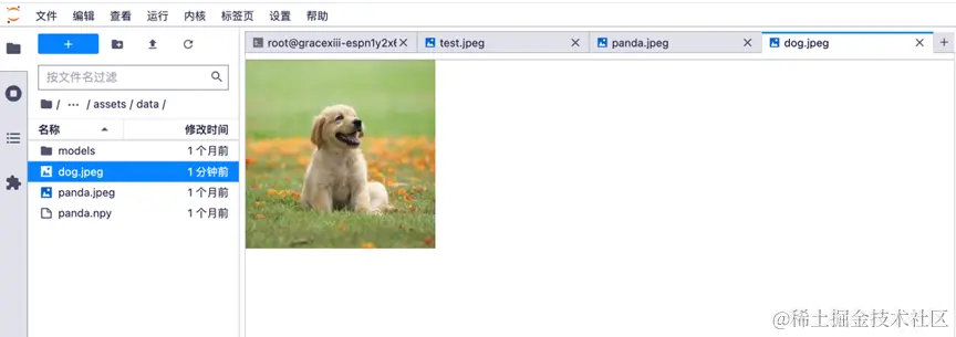 然后我们将 README 里的 panda.jpeg 改为 dog.jpeg,图片的名称也改为 dog。使用 Shift+Enter 运行这段代码。