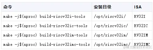 运行以下命令将构建 RISC-V GNU 工具链和库,目标是纯 RV32I,并将它们安装在 /opt/riscv32i 中:
