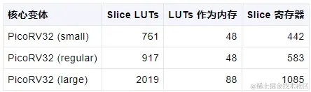 - 尺寸和性能:PicoRV32设计紧凑,在Xilinx 7系列FPGA架构中占用大约750-2000个逻辑单元(LUTs)。它能够达到很高的时钟频率,在7系列Xilinx FPGAs上为250-450 MHz。