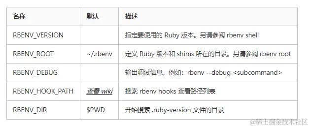 请注意,你需要启用 rbenv 的 shell 集成(安装说明的步骤 3)才能使用此命令。如果你不想使用 shell 集成,你可以简单地自己设置