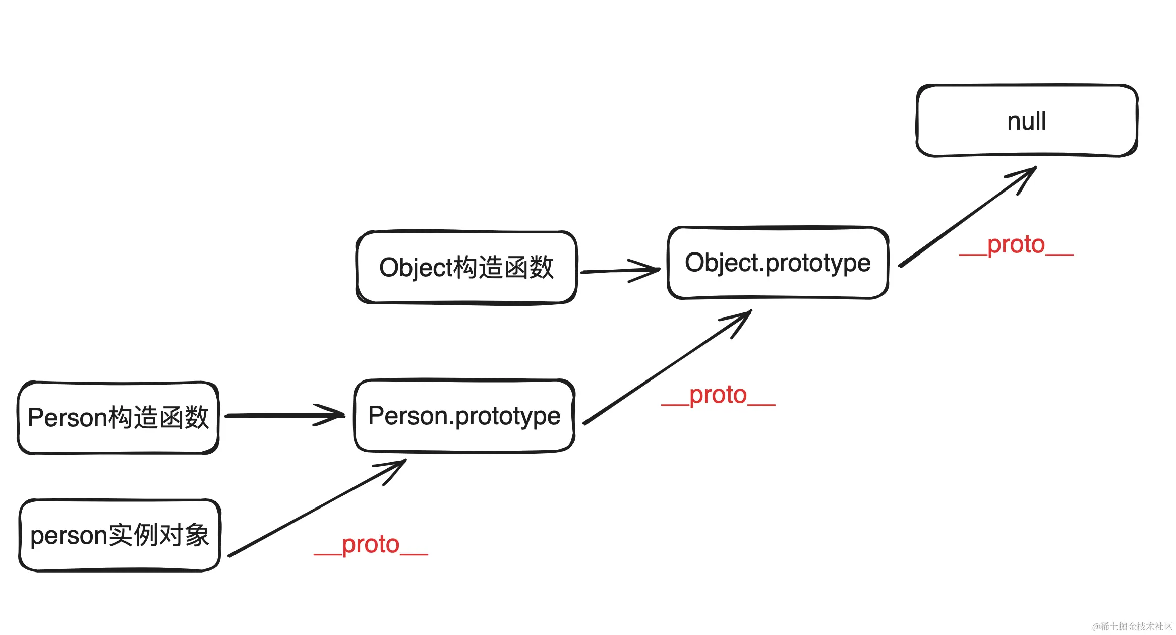__proto__指向构造函数的prototype,构造函数的prototype同样是对象,其__proto__指向上一层原型对象,直到Object.prototype,形成原型链。