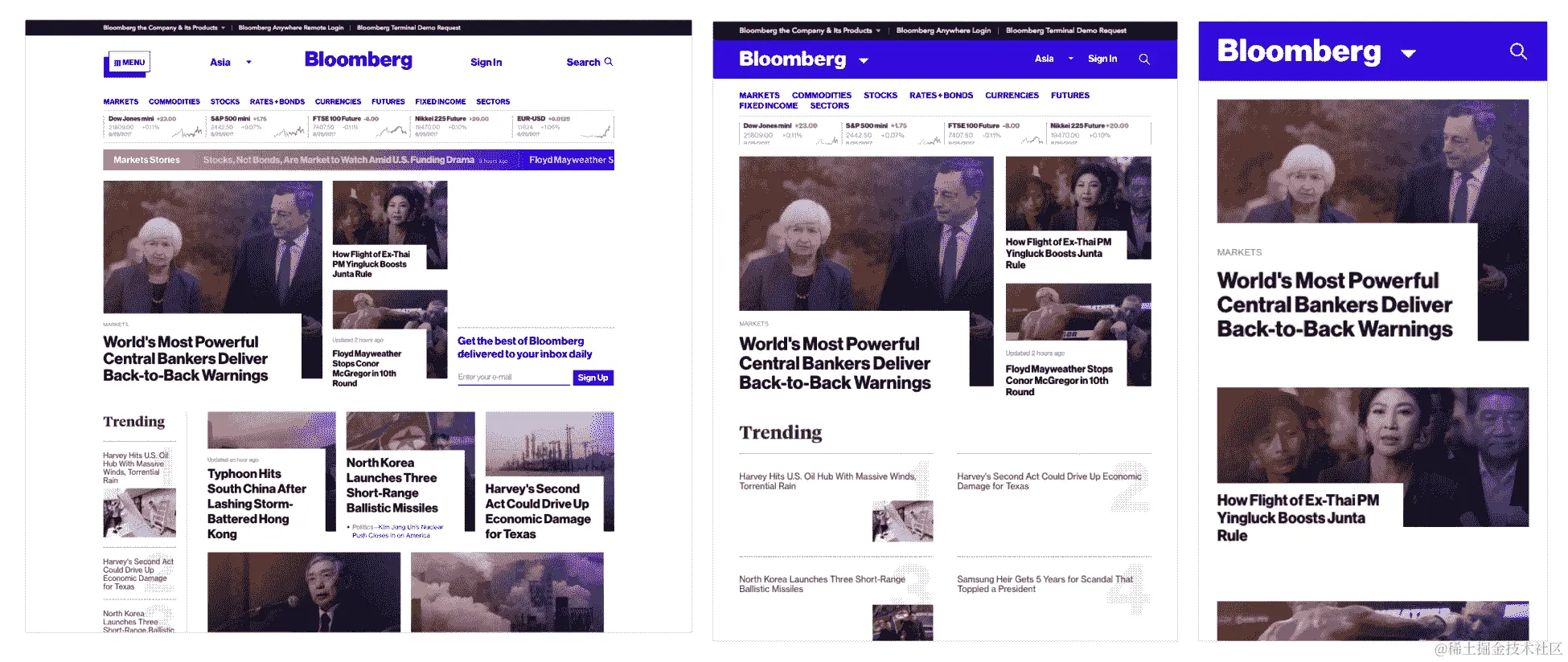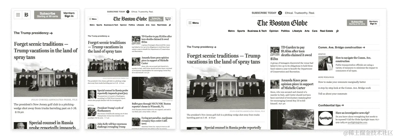 媒体查询是 CSS3 模块,允许内容呈现适应条件,如屏幕分辨率(例如,智能手机屏幕与计算机屏幕相比)。 从左到右,我们有 iPhone,iPad 和桌面版本。 这是网格系统和媒体查询的完美示例(www.wired.com/2011/09/the-boston-globe-embraces-responsive-design/):