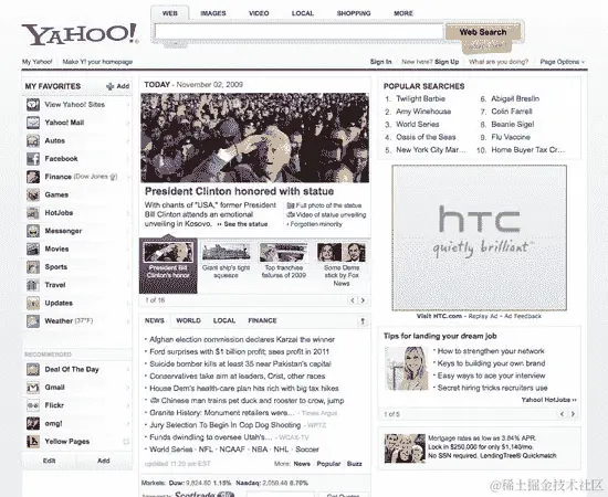 我们将在书的第六章中详细探讨这一点,构建你自己的网站。以下是雅虎网站(2009 年)的一些设计变化: