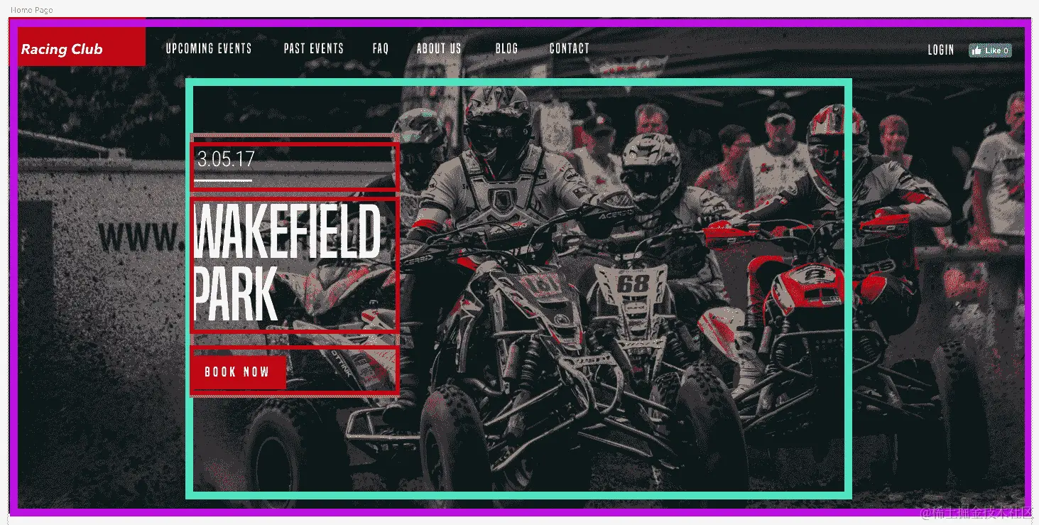 此部分仅包含一个标题、两个图像、文本和一个按钮。我们需要在我们通常的容器内创建一个块(如橙色所示)。