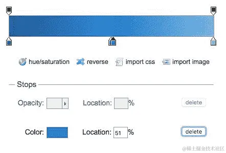 默认情况下有四个颜色停止点,我们只需要两个。因此,点击渐变条中间的两个停止点并删除它们。单击颜色停止点会显示一组新的控件,包括删除按钮: