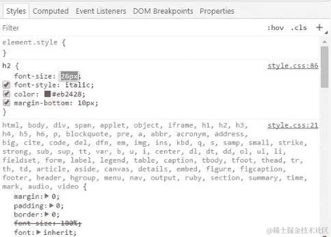 让我们跳到一个 CSS 文件中,看看下面代码块中的一个规则集。它是针对h2-一个二级标题。它设置了font-size为26px,font-style为italic,color为红色,margin-bottom为10px: