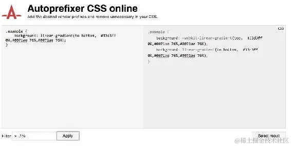 我将在 Autoprefixer 工具的左侧输入非前缀声明,它将根据我提供的浏览器流行度标准输出需要的供应商前缀。我希望我的渐变在市场份额大于 0.1%的所有浏览器中显示。