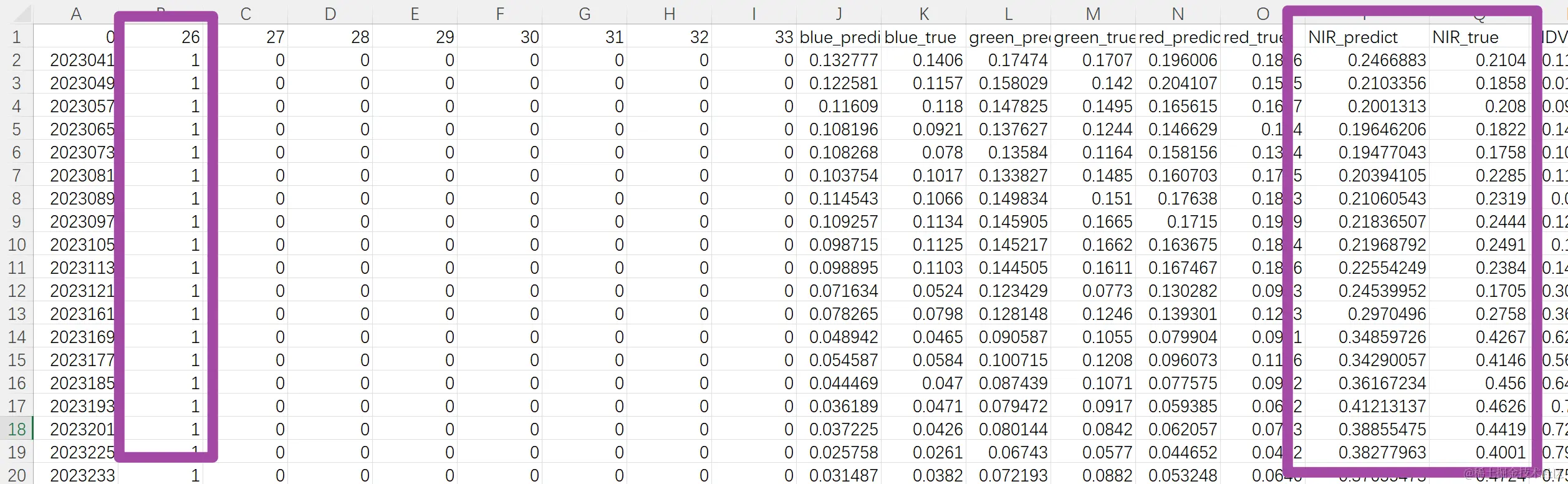现有一个.csv格式的表格文件,其各列数据的开头部分如下图所示。其中,对于名称为26的这1列(左侧紫色框内数据),我们希望提取其数值等于1的所有行,并对这些行中的NIR_predict列与NIR_true列(右侧紫色框内数据)的数值加以密度散点图的绘制。