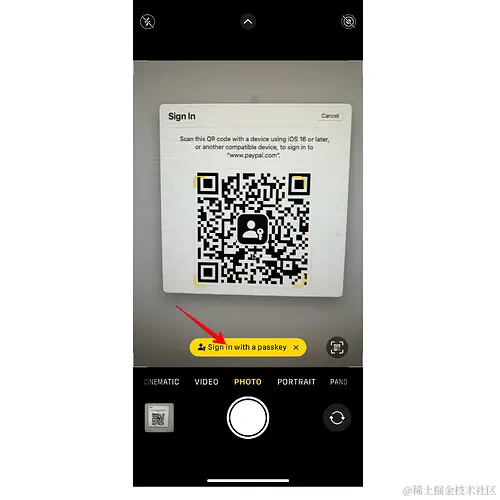 使用手机上面的照相功能,在照相机的下方,会显示是否使用 PassKey 进行登录。