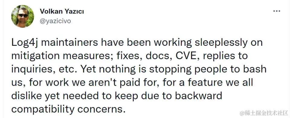Log4j 维护者之一 @Volkan Yazıcı 在某社交平台大力吐槽: