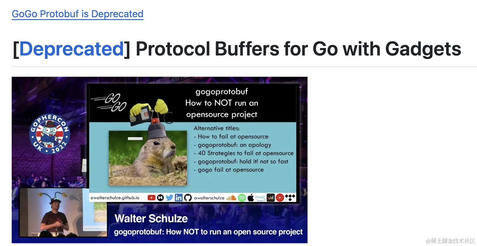 总结而言,你会发现 gogo/protobuf 这一个第三方库,比官方库性能更好,特性更丰富。在当时维护的也很积极。因此成为了最为出名的 protobuffer 库。