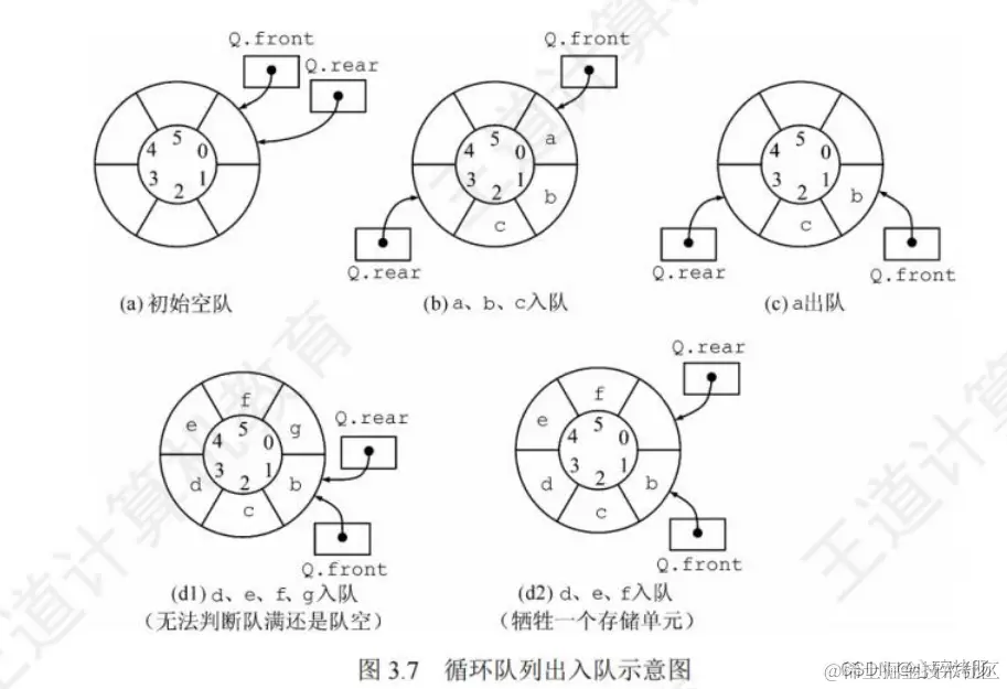 1) 牺牲一个单元来区分队空和队满,入队时少用一个队列单元,这是一种较为普遍的做法,约定以“队头指针在队尾指针的下一位置作为队满的标志”,如图 3.7(d2)所示。
