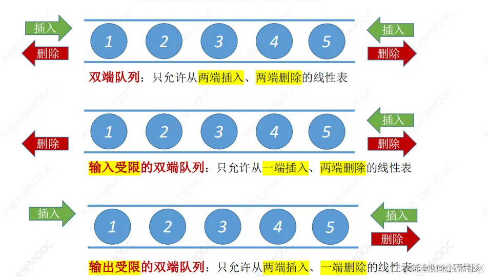输出受限的双端队列:允许在一端进行插入和删除,但在另一端只允许插入的双端队列称为输出受限的双端队列。