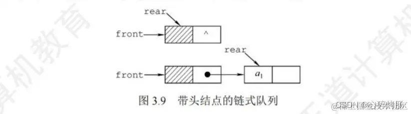 不难看出,不带头结点的链式队列在操作上往往比较麻烦,因此通常将链式队列设计成一个带头结点的单链表,这样插入和删除操作就统一了,如图3.9所示。