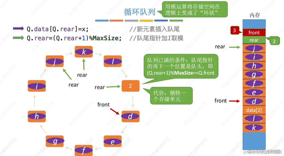- 队满条件:(Q.rear+1)%MaxSize==Q.front。