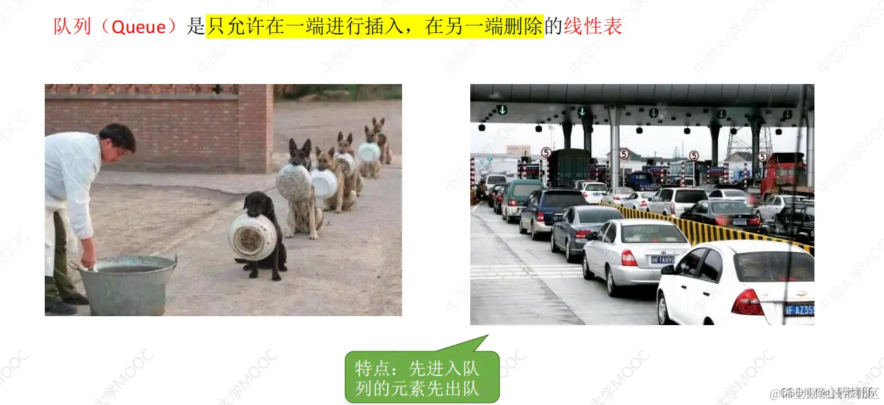 队列(Queue)简称队,也是一种操作受限的线性表,只允许在表的一端进行插入,而在表的另一端进行删除。向队列中插入元素称为入队或进队;删除元素称为出队或离队。这和我们日常生活中的排队是一致的,最早排队的也是最早离队的,其操作的特性是先进先出。