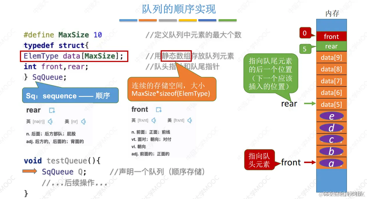 队列的顺序实现是指分配一块连续的存储单元存放队列中的元素,并附设两个指针:队头指针 front 指向队头元素,队尾指针rear 指向队尾元素的下一个位置(不同教材对front和rear的定义可能不同,例如,可以让 rear 指向队尾元素、front 指向队头元素。对于不同的定义,出队入队的操作是不同的)。