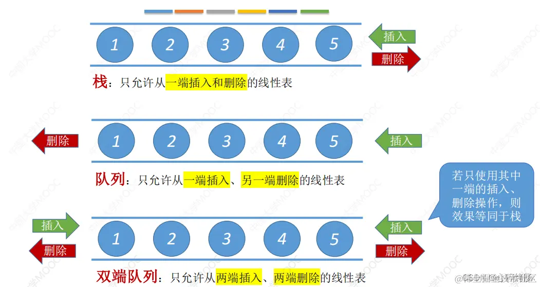 需要注意的是,栈和队列是操作受限的线性表,因此不是任何对线性表的操作都可以作为栈和队列的操作。比如,不可以随便读取栈或队列中间的某个数据。