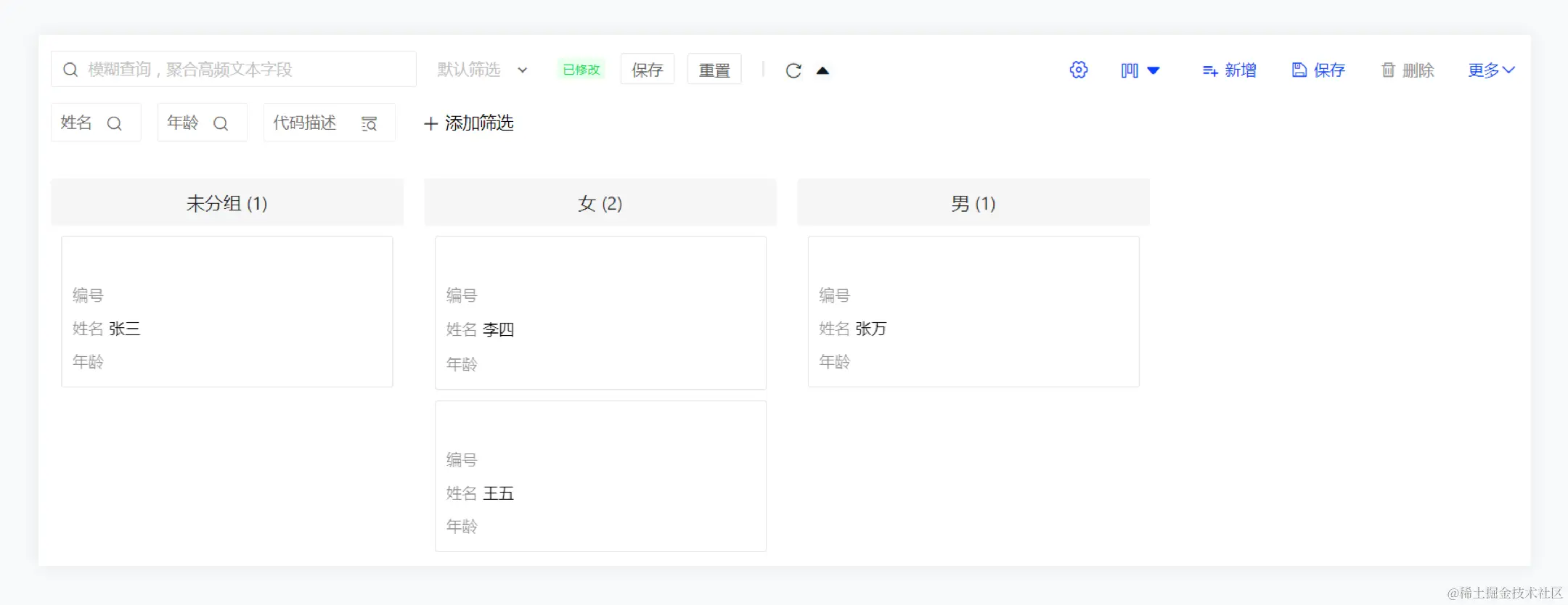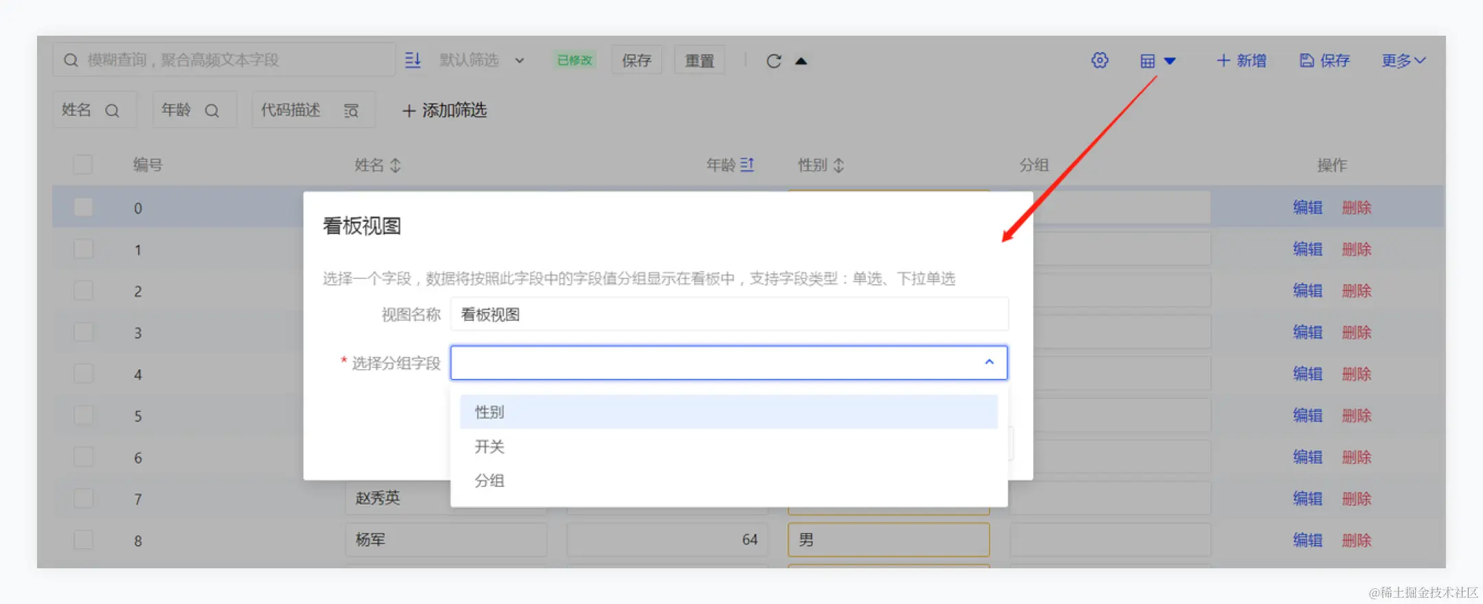 - 以性别为分组维度,新建看板视图
