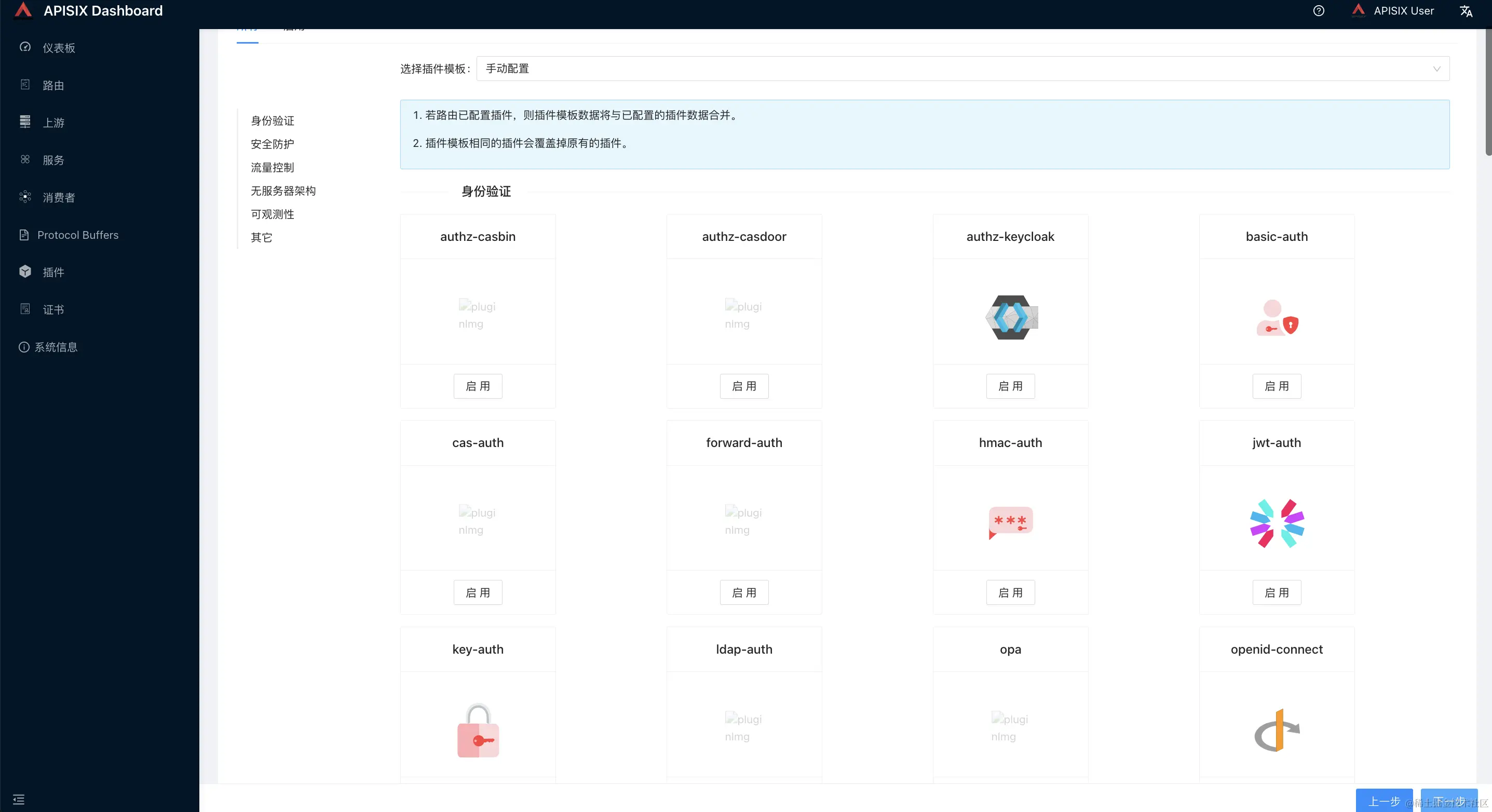 apisix 提供了很多插件,如认证,限流,可观测性,以下以限流为例,通过 dashboard 进行可视化的操作(也可以通过接口)