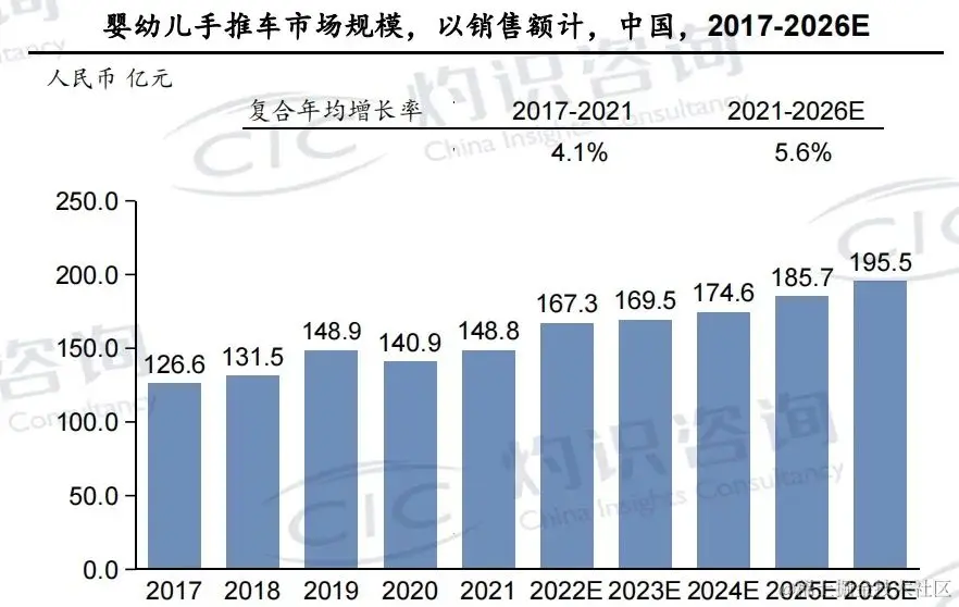 婴儿出行赛道同样如此。数据显示,中国婴幼儿推车的市场规模在近年来维持可持续增长,于2021年达到148.8亿元,并预计未来五年以5.6%的复合年均增长率持续提升,在2026年达到195.5亿元。