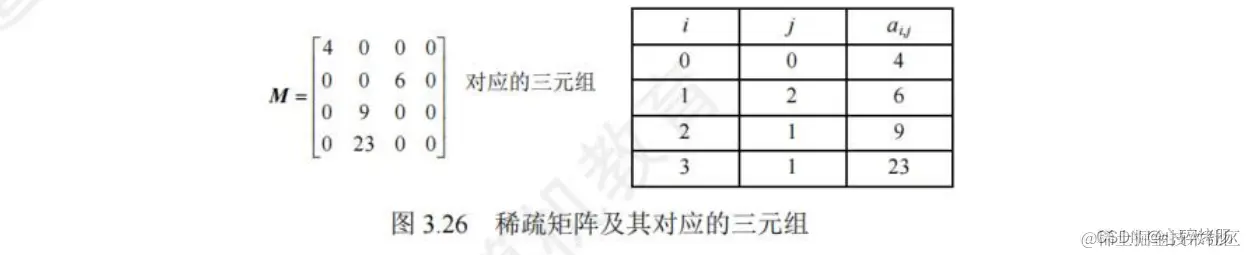 若采用常规的方法存储稀疏矩阵,则相当浪费存储空间,因此仅存储非零元素。但通常非零元素的分布没有规律,所以仅存储非零元素的值是不够的,还要存储它所在的行和列。因此,将非零元素及其相应的行和列构成一个三元组(行标i,列标j,值aᵢ,ⱼ ),如图 3.26 所示。然后按照某种规律存储这些三元组线性表。稀疏矩阵压缩存储后便失去了随机存取特性。