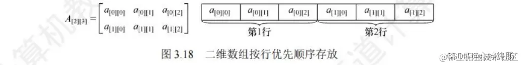例如,对于数组 A[2][3],它按行优先方式在内存中的存储形式如图 3.18所示。