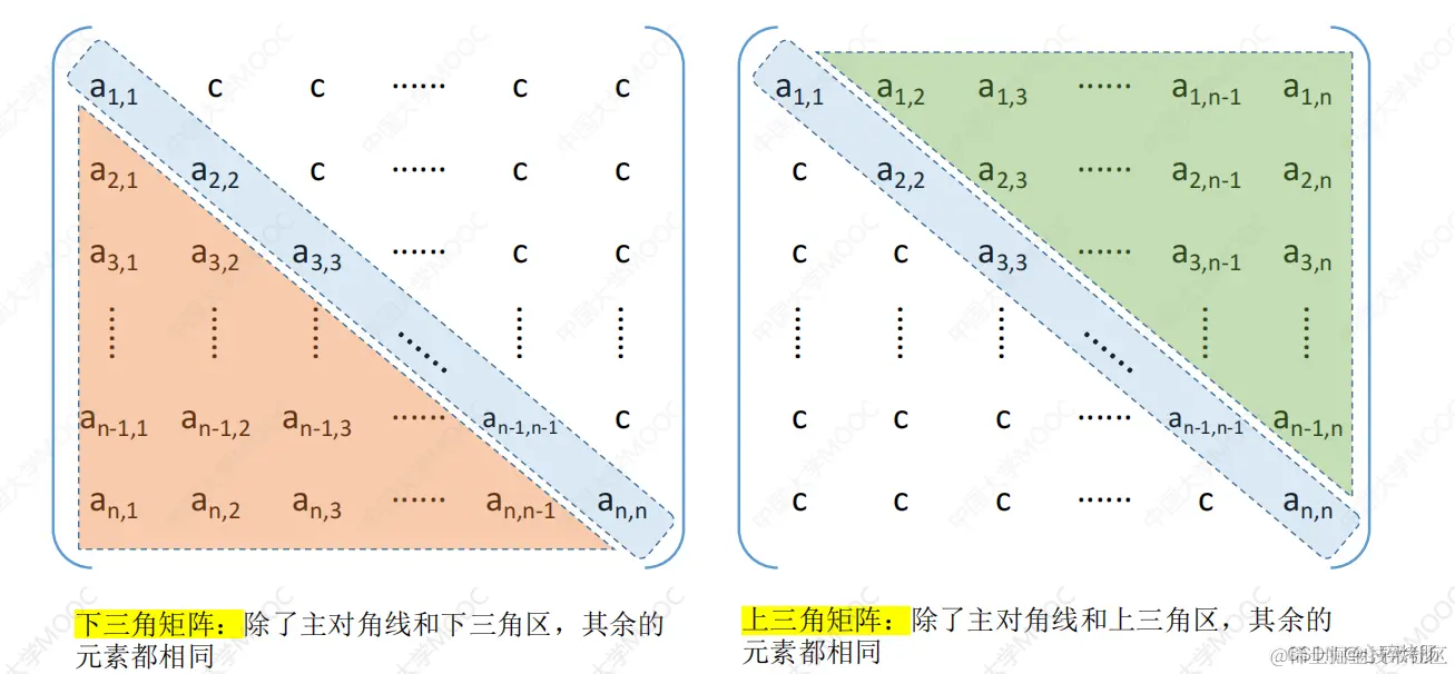 特殊矩阵的压缩存储方法:找出特殊矩阵中值相同的矩阵元素的分布规律,把那些呈现规律性分布的、值相同的多个矩阵元素压缩存储到一个存储空间中。