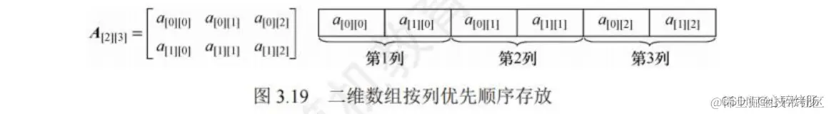 例如,对于数组 A[2][3],它按列优先方式在内存中的存储形式如图 3.19所示。
