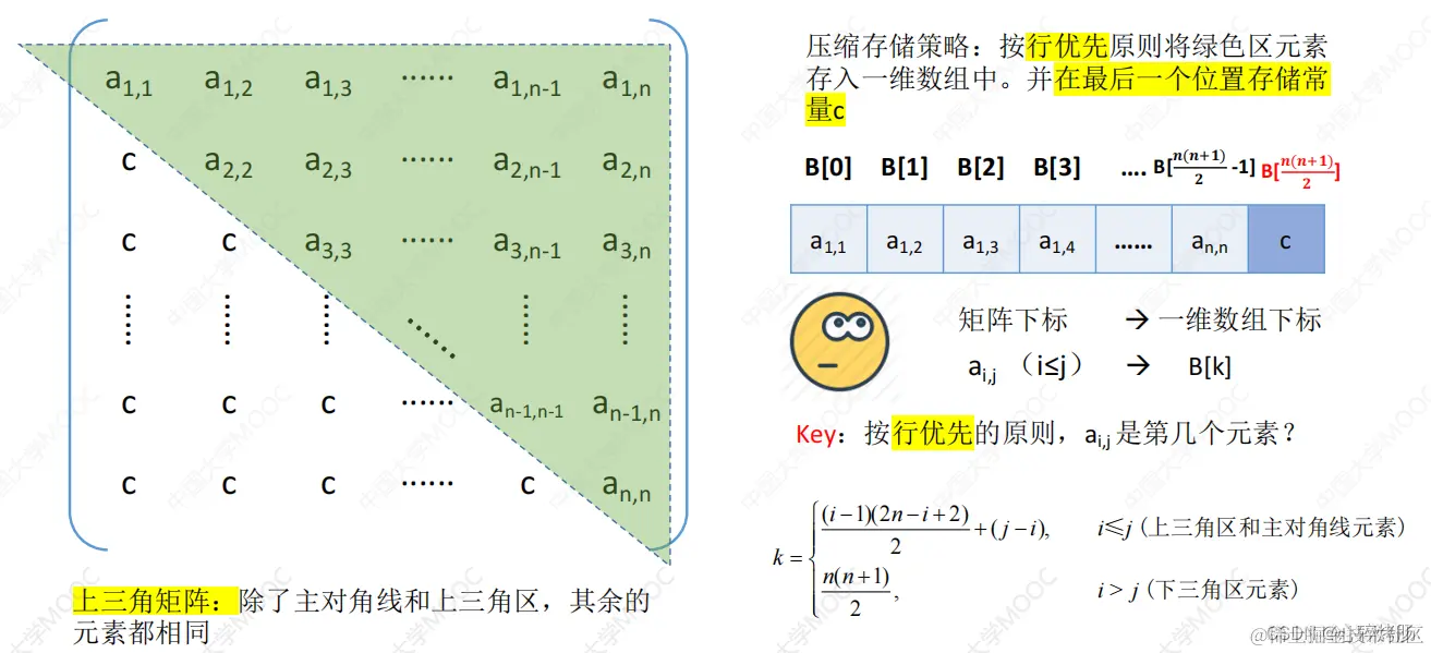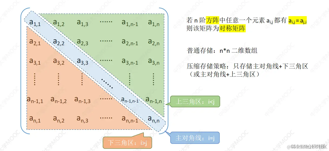 对于n阶对称矩阵,上三角区的所有元素和下三角区的对应元素相同,若仍采用二维数组存放,则会浪费几乎一半的空间,为此将n阶对称矩阵A存放在一维数组B[n(n+1)/2]中,即元素aᵢ,ⱼ,存放在bₖ以中。比如只存放下三角部分(含主对角)的元素。