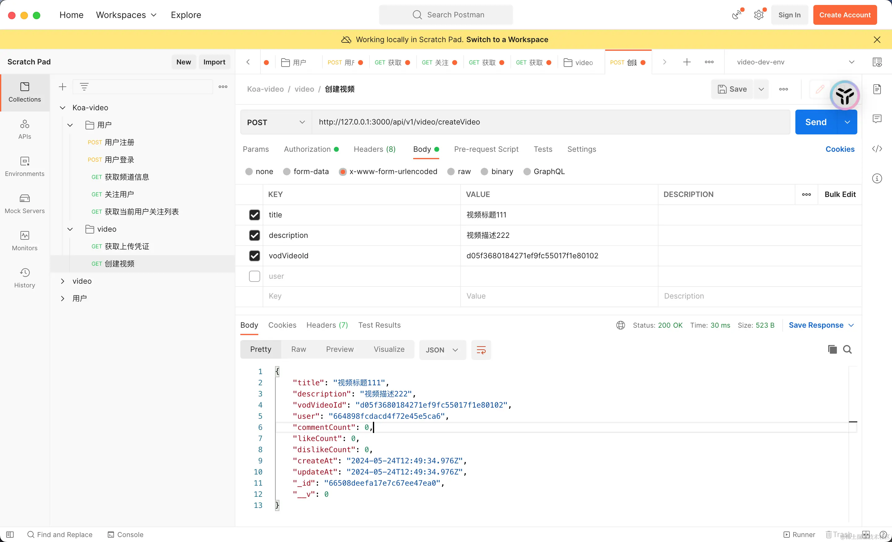 接下来,我们创建一个控制器,用于处理视频的创建请求。该控制器从请求体中获取视频信息,并保存到数据库中。