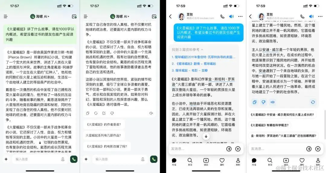 我们的问题是皮尔斯·布朗的代表作《火星崛起》,曾被《娱乐周刊》评为2014年度最佳图书,但知名度不如《火星救援》、《星球崛起》等可能被AI混淆的名著。海螺AI准确理解了我们的需求,生成的故事梗概可圈可点,并给出了深刻的评价;豆包将我们的需求误解为《星球崛起》,生成的内容居然是《火星三部曲》的介绍。