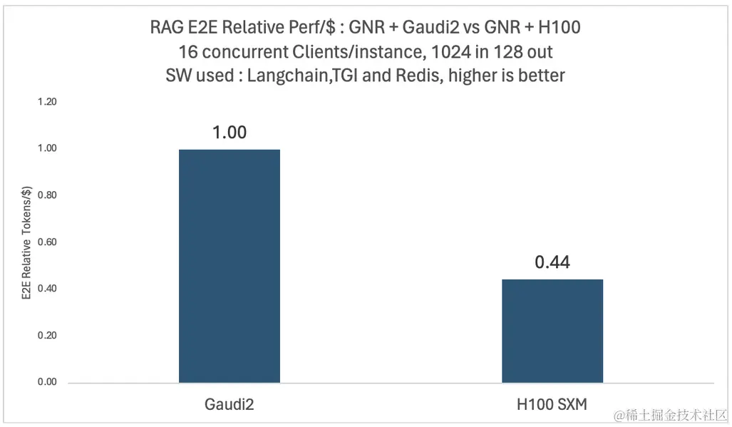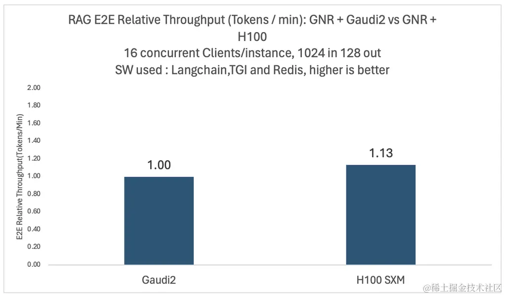 BAAI/bge-base v1.5。测试环境: TGI-gaudi 1.2.1、TGI-GPU 1.4.5、Python 3.11.7、Langchain 0.1.11、sentence-transformers 2.5.1、langchain benchmarks 0.0.10、redis 5.0.2、cuda 12.2.r12.2/compiler.32965470_0, TEI 1.2.0 - RAG 查询最大输入长度 1024,最大输出长度 128。测试数据集: langsmith Q&A。并发客户端数 16