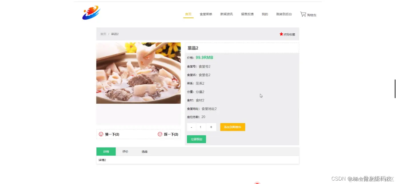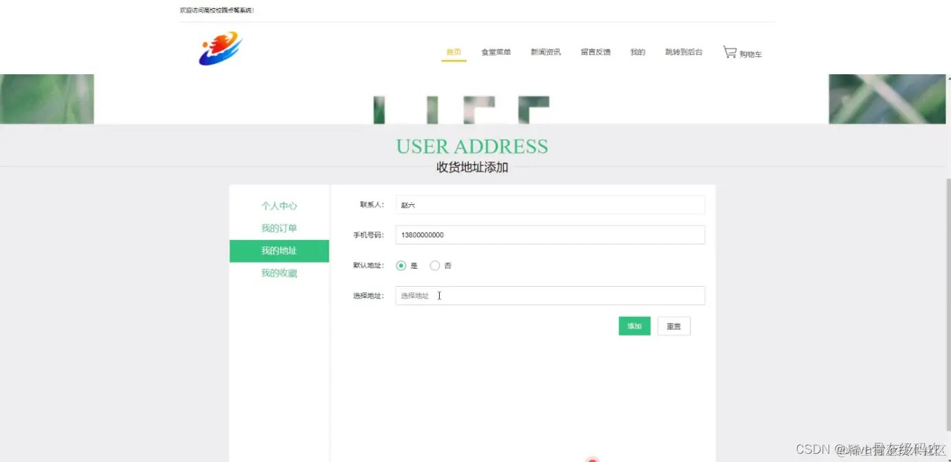 食堂菜单,在食堂菜单页面通过填写食堂号、食堂名、菜品、菜系、图片、分量、食材、食堂地址、详情、价格、座位总数等信息进行添加到购物车、立即预定、点我收藏等操作,如图5-3所示。在我的地址页面通过填写联系人、手机号码、默认地址、选择地址等信息进行添加或重置操作,如图