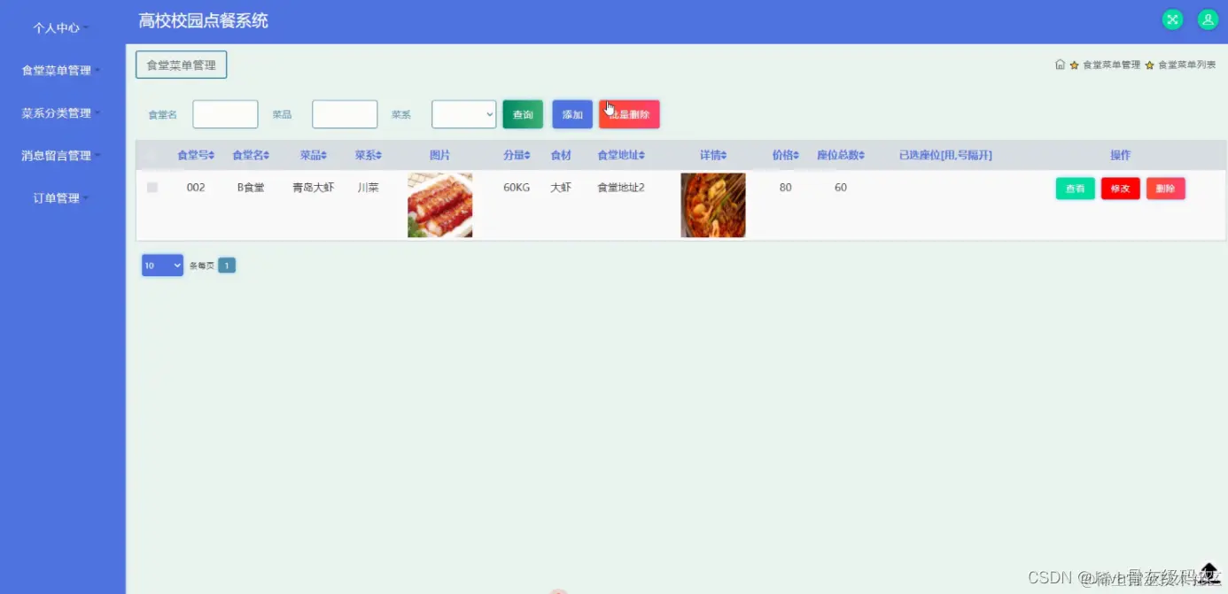 食堂菜单管理,在食堂菜单管理页面中通过填写食堂号、食堂名、菜品、菜系、图片、分量、食材、食堂地址、详情、价格、座位总数、已选座位[用号隔开]等信息,还可以根据需要对食堂菜单管理进行查看、修改、删除等操作,如图