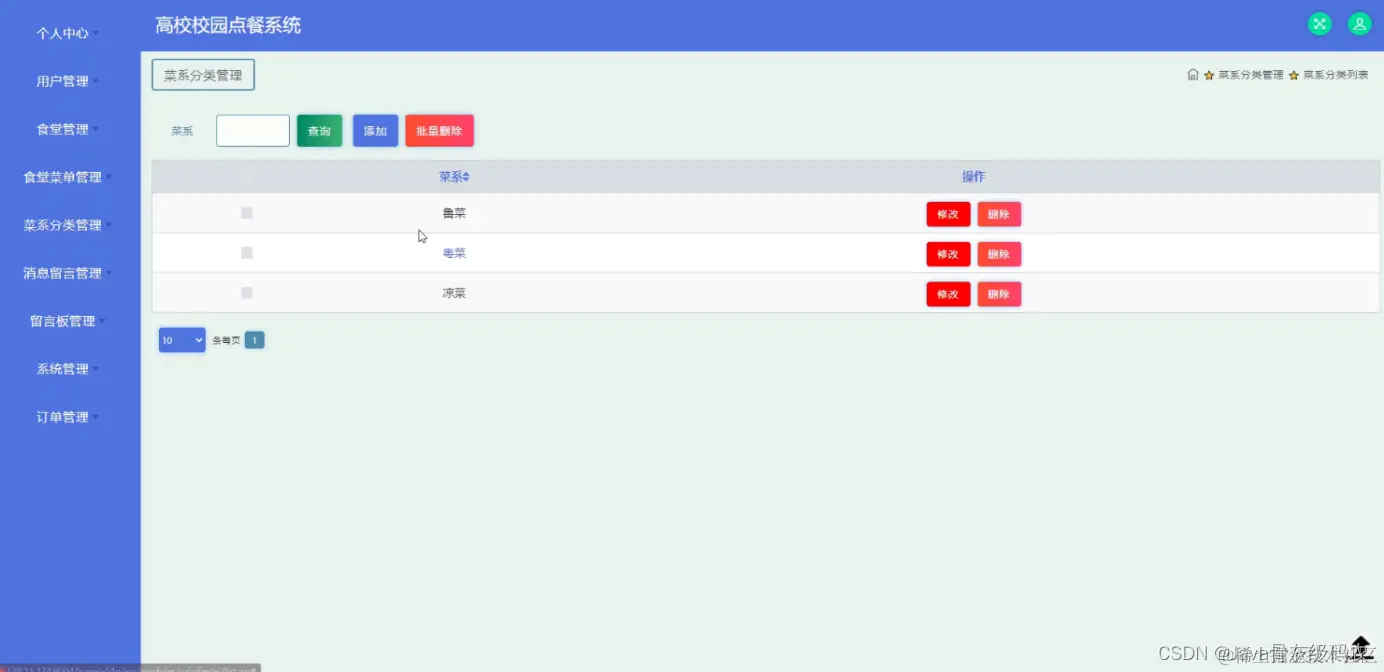 菜系分类管理,在菜系分类管理页面中可以查看菜系等信息,并可根据需要对已有菜系分类管理进行修改或删除等操作,如图