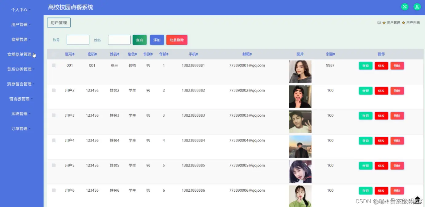 用户管理,在用户管理页面中可以通过填写账号、密码、姓名、角色、性别、年龄、手机、邮箱、照片、余额等内容进行查看、修改、删除等操作,如图5-6所示。
