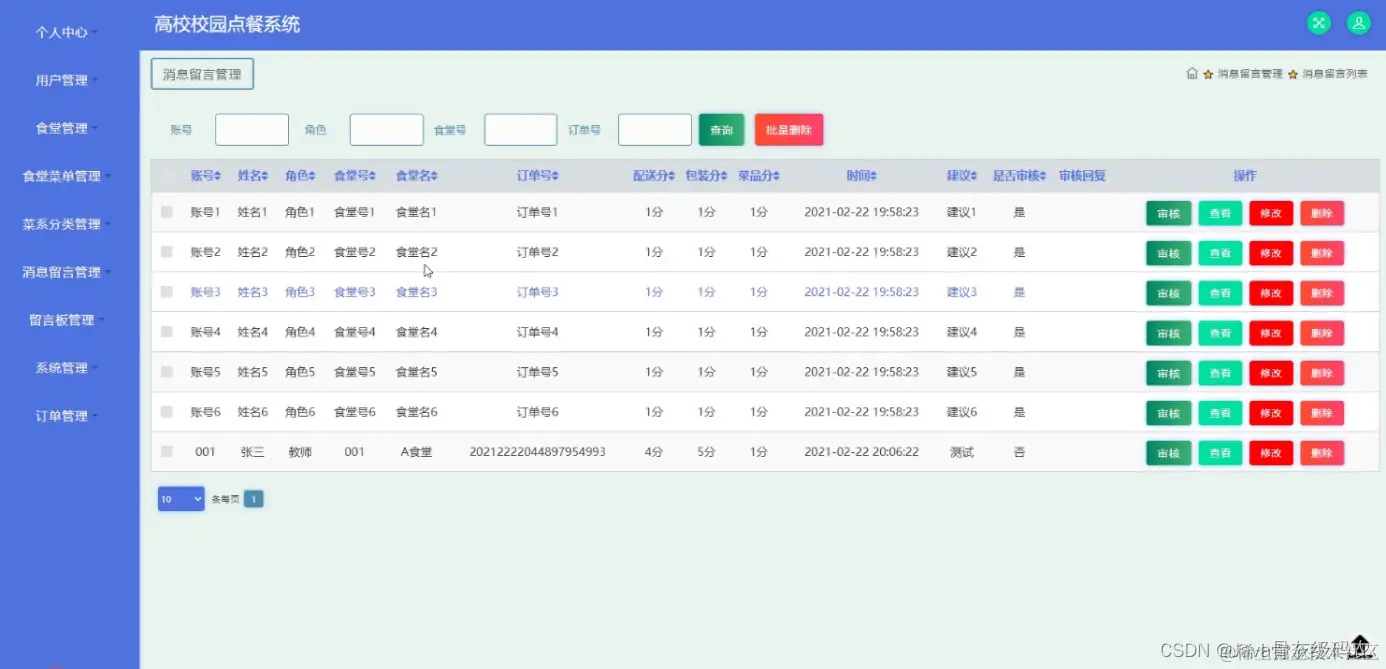 消息留言管理,在消息留言管理页面中可以查看账号、姓名、角色、食堂号、食堂名、订单号、配送分、包装分、菜品分、时间、建议、是否审核、审核回复等信息,并可根据需要对已有消息留言管理进行审核、查看、修改或删除等详细操作,如图