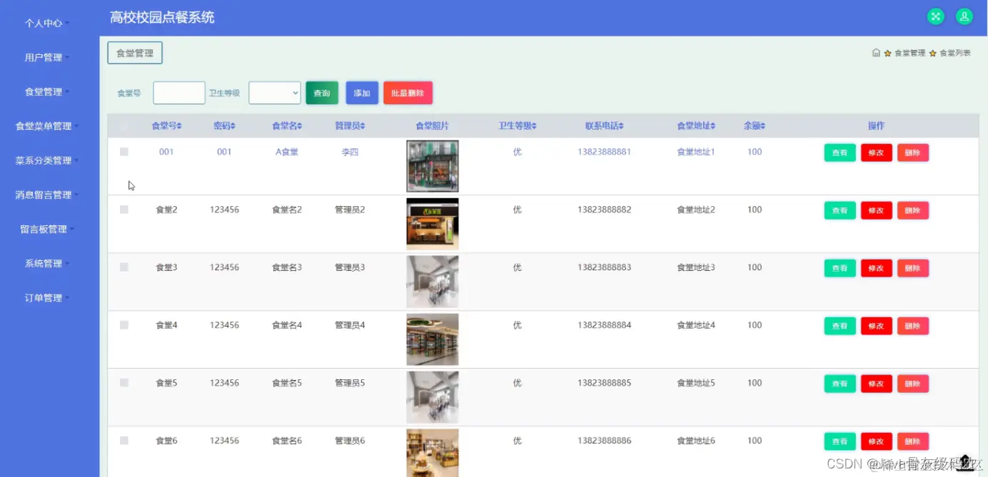 食堂管理,在食堂管理页面中可以查看食食堂号、密码、食堂名、管理员、食堂照片、卫生等级、联系电话、食堂地址、余额等信息,并可根据需要对已有食堂管理进行查看、修改、删除等操作,如图