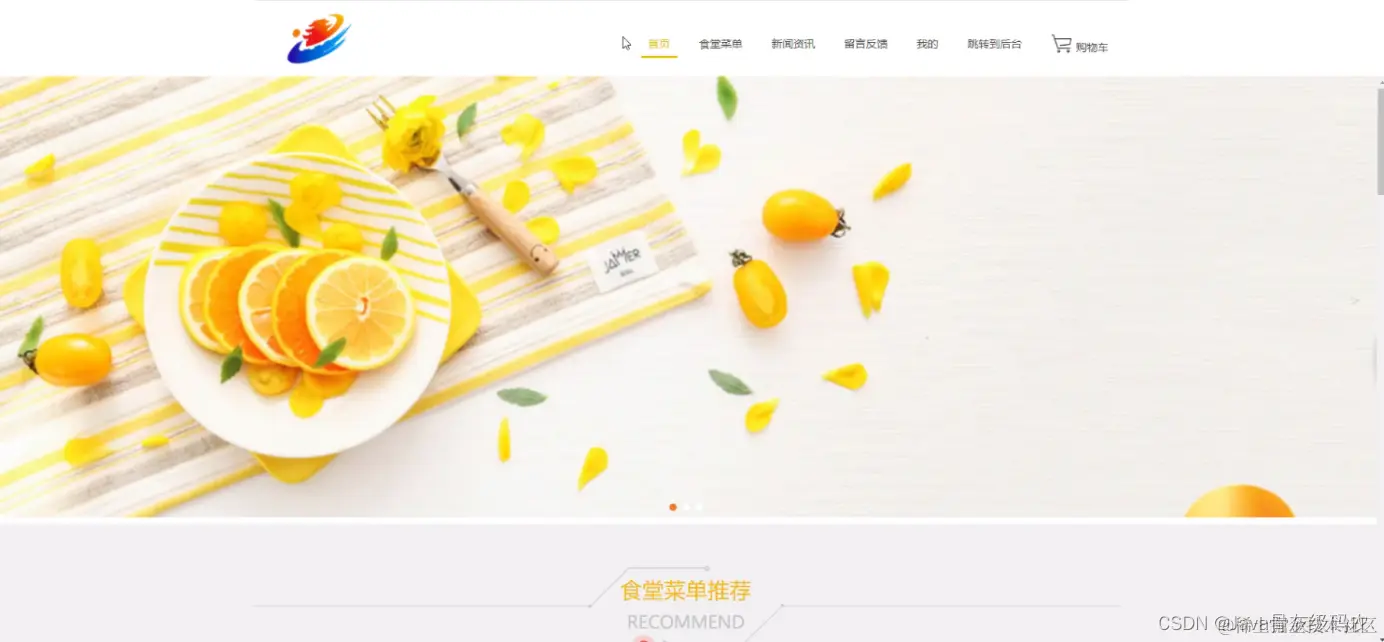 高校校园点餐系统,在系统首页可以查看首页、食堂菜单、新闻资讯、留言反馈、我的、跳转到后台、购物车等内容,如图