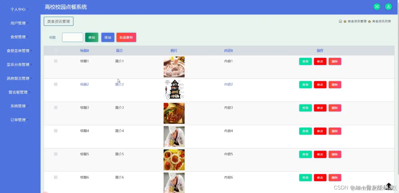 美食资讯管理,在美食资讯管理页面中可以查看标题、简介、图片、内容等内容,并且根据需要对已有美食资讯管理进行查看、修改或删除等详细操作,如图