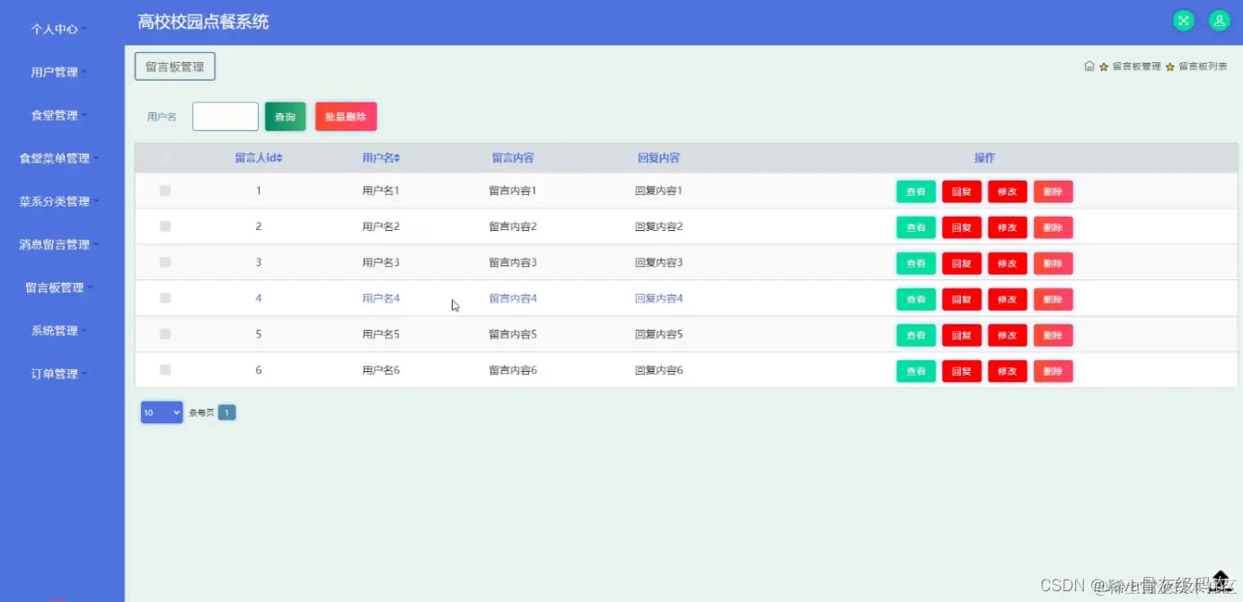 留言板管理,在留言板管理页面中可以查看留言人id 、用户名、留言内容、回复内容等内容,并且根据需要对已有留言板管理进行查看、回复、修改或删除等详细操作,如图