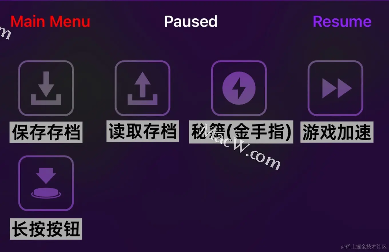4、游戏菜单分别是保存存档、读取存档、秘籍、加速、长按按钮