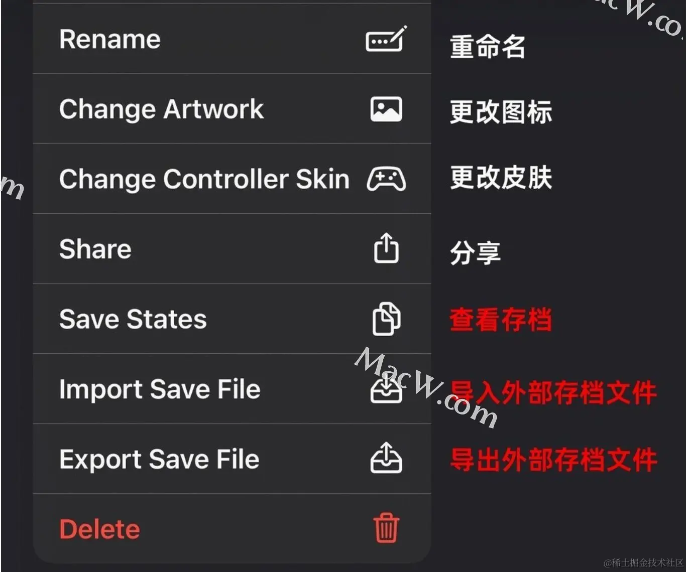 1、主页长按游戏图标弹出的菜单可以查看和读取存档、也可以导入导出外部存档